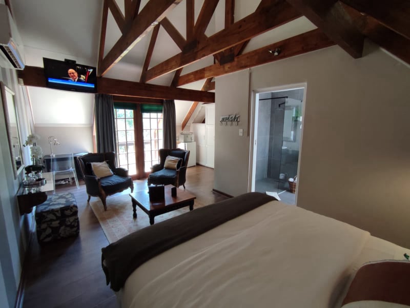 The Caddie Loft is a private upstairs unit with two single beds perfect for friends or family sharing. Adjacent, the master bedroom boasts a queen-sized bed with an en-suite bathroom. Relax and reconnect in the spacious lounge area with air conditioning.